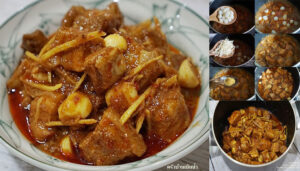 ใส่ขิงซอย และผงฮังเล เคี่ยวต่อจนเนื้อหมูนุ่มได้ที่ ชิมรสให้ถูกใจ ระหว่างเคี่ยวถ้าน้ำแห้งไปก็เติมน้ำได้เล็กน้อย
