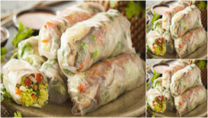 3. วางถั่วงอกและส่วนผสมไส้บนแผ่นก๋วยเตี๋ยว พับแป้งด้านข้างทั้ง 2 ด้านมาทับบนไส้แล้วม้วนเป็นท่อนกลม หั่นชิ้น