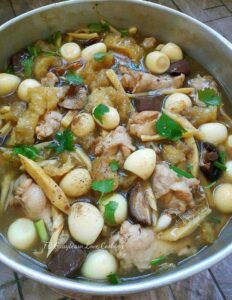 3. เมื่อน้ำเดือดอีกครั้ง ช้อนเครื่องสมุนไพรทิ้งไปใส่กระเพาะปลาต้มให้กระเพาะปลา ดูดรสชาติน้ำในหม้อ ใส่หน่อไม้เส้น ไก่ต้มฉีก ไข่นกกระทา เลือดไก่