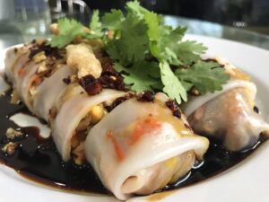 เส้นใหญ่ใช้แบบไม่ตัดเส้น โรยด้วยกุ้งแห้งแดง ตักไส้วางลงบนเส้นใหญ่ ห่อแบบง่าย ๆ นำไปนึ่ง ทาน้ำมันเคลือบกันเส้นติด