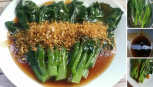 นำน้ำซอสราดไปบนคะน้าที่เราลวกเตรียมไว้