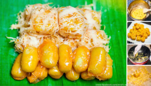 -แต่เมื่อน้ำเชื่อมเหนียวแล้วเบาไฟลงเกือบอ่อน แล้วหาไม่จิ้มฟัน จิ้มตัวขนมแล้วนำไปชุบไข่แดง