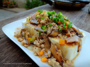 พอเดือดอีกครั้งปิดไฟ นำไปราดบนเต้าหู้ โรยด้วยต้นหอมซอย พร้อมเสริฟ