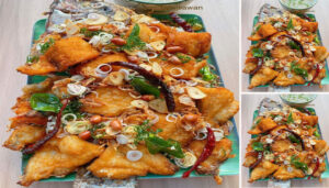 2.นำปลามาหั่นเป็นชิ้นๆ แล้วนำลงทอดให้สุกกรอบ สะเด็ดน้ำมันเอาขึ้น จัดใส่จาน