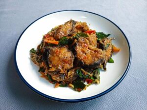 ปรุงรสชาติด้วยน้ำปลาและน้ำตาลทรายไม่ขัดสี เติมน้ำเปล่า (น้ำล้างครก) ลงไปนิดหน่อย จากนั้นใส่ปลาดุกทอดลงไป