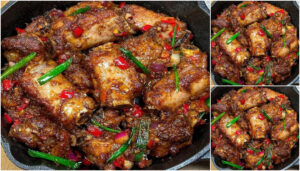 5.ใส่ซี่โครงหมูที่ทอดไว้ลงไปในกระทะ ปรุงรสด้วยน้ำปลา ซอสหอยนางรม และน้ำตาลทราย
