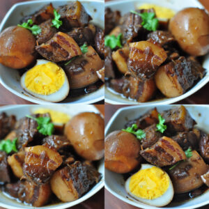 ลดไฟอ่อนเคี่ยวหมูไปจนกว่าเนื้อหมูจะสุกนุ่ม เหลือน้ำขลุกขลิก (หากจะเพิ่มไข่ต้มสามารถ ใส่ลงในเคี่ยวรวมกันได้ในขั้นตอนนี้)