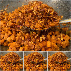 คั่ วพริกป่น ในน้ำมัน กากหมู ให้หอมก่อน แล้วค่อยใส่กากหมู เกลือหอมเจียว กระเทียม​เจียว คลุกเข้าด้วยกัน