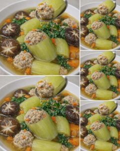5. ต้ม: พอน้ำเดือด ใส่แตงกวายัดไส้ลงไป ลดไฟอ่อน เคี่ยว (ประมาณ 20-30 นาที) จนแตงกวาเริ่มนิ่มและใส หมูสุก