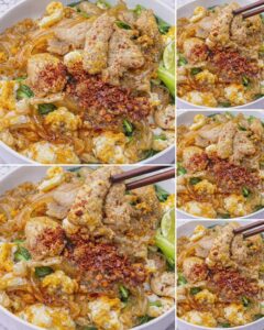 -ใส่น้ำมันในกะทะ ทุบกระเทียมสับ ลงผัดให้หอม ใส่ไข่ไก่ เนื้อหมูหมักใส่เส้นตามชอบ