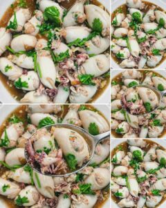 2.นำไปยัดในปลาหมึก เสียบหัวด้วยไม้จิ้มฟัน แล้วบั้งที่ตัวปลาหมึก นำไปนึ่งให้สุก